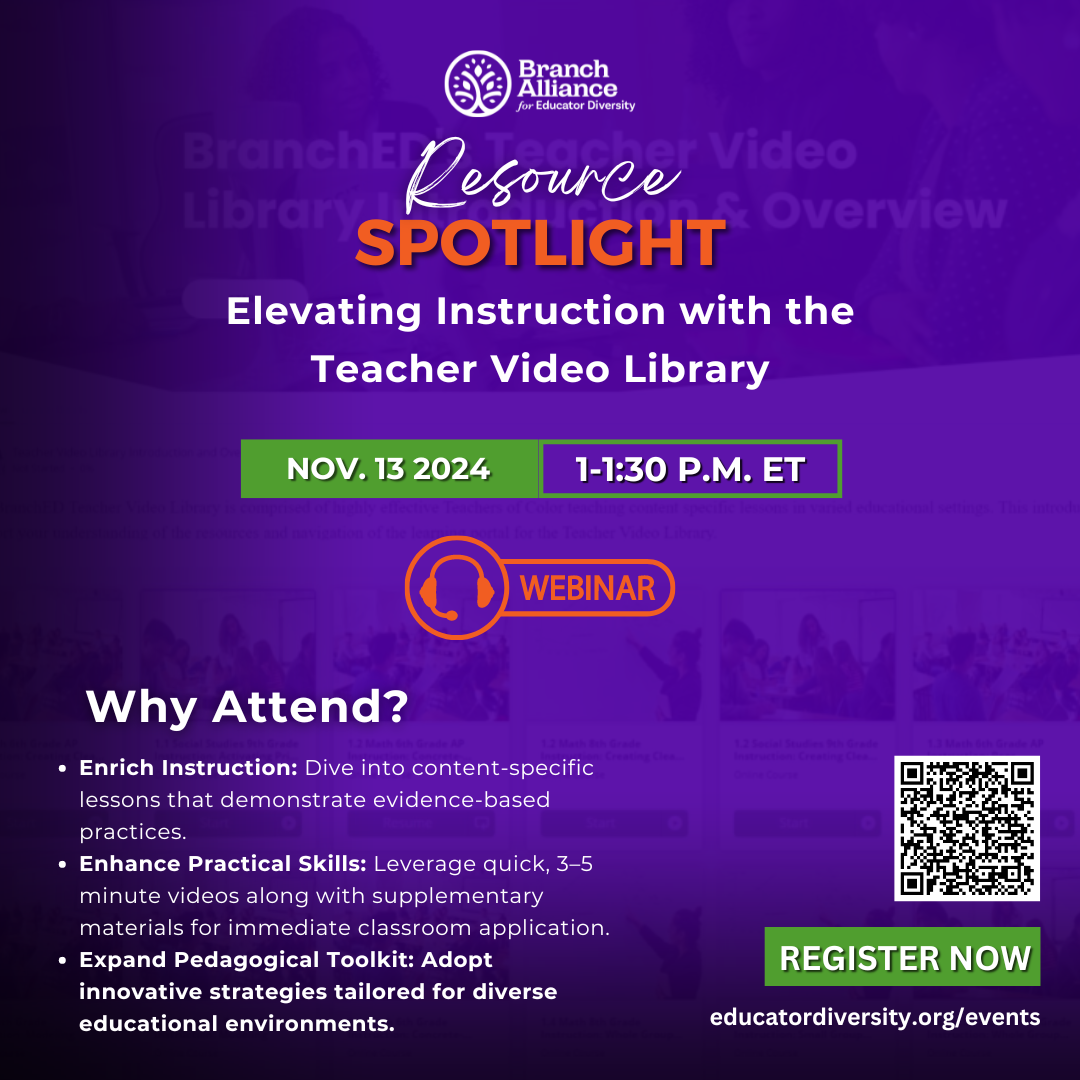 The Teacher Video Library comprises highly effective, equity focused Teachers of Color teaching content-specific lessons. Each video case consists of a 3–5-minute classroom video which showcases evidence-based practices and provides supplementary materials that guide the viewer. Come and learn more about the library and how you can use it in your own practice.