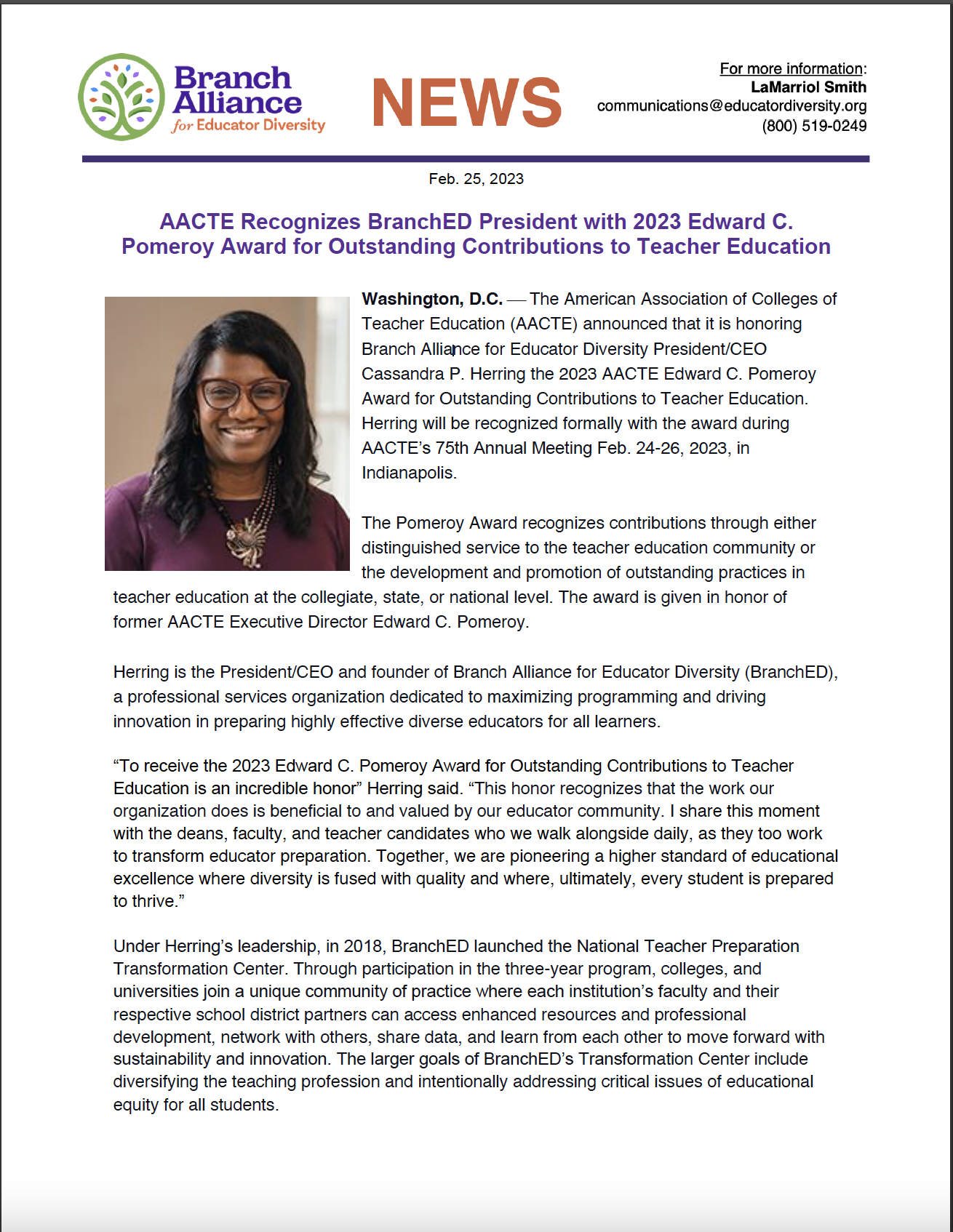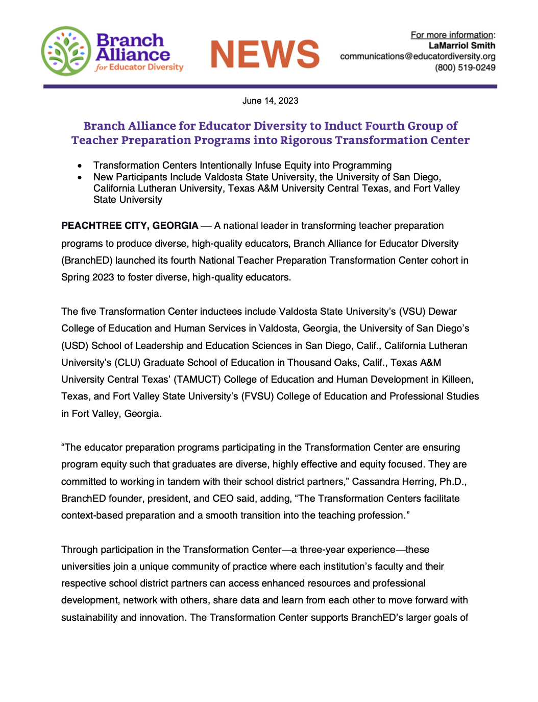 News Releases 2023 News Releases Transformation Center-IV Pomeroy Award News Release NEWS ROOM News Releases 2023 News Release News Release Archives Publications Publications Multimedia Multimedia BranchED E-News 2021 BranchED Bulletins BranchED Bulletin Archives Media Mentions 2021 Media Mentions Media Mentions Archives Media Tool Kit MEDIA TOOL KIT