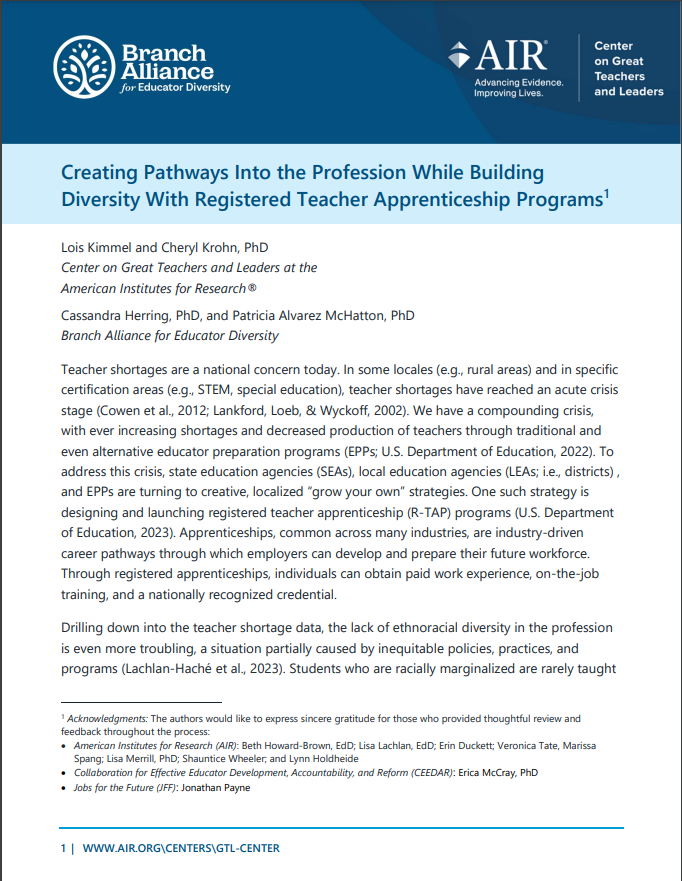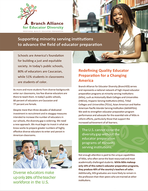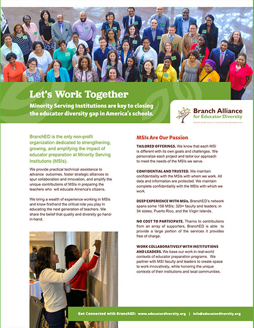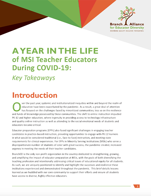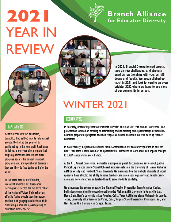 Publications PUBLICATIONS Creating Pathways Into the Profession While Building Diversity With Registered Teacher Apprenticeship Programs Year in Review A summary of BranchED's work in 2021 General Information BranchED General Brochure — Higher Ed BranchED General Brochure — K-12 BranchED Services Case Studies A Year in the Life Covid-19 Creating a Community of Learners: A Case Study For a copy of the “unabridged” version, contact BranchED here. Request a Copy Data Empowerment Case Study Toolkits Data Toolkit: Data Empowerment for Continuous Improvement Download your copy here. Download a Copy Annual Reports The Early Years Coming Soon. MULTIMEDIAPodcasts Dr. Cassandra Herring, Branch Alliance for Educator Diversity Next Education Workforce January 5, 2021 Videos NEWS ROOM News Releases 2023 News Release News Release Archives Publications Publications Multimedia Multimedia BranchED E-News 2021 BranchED Bulletins BranchED Bulletin Archives Media Mentions 2021 Media Mentions Media Mentions Archives Media Tool Kit MEDIA TOOL KIT